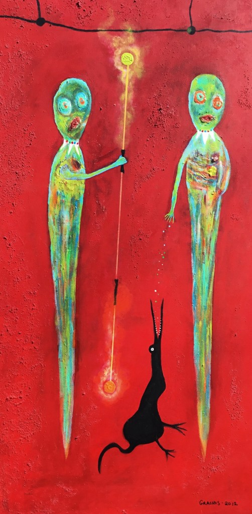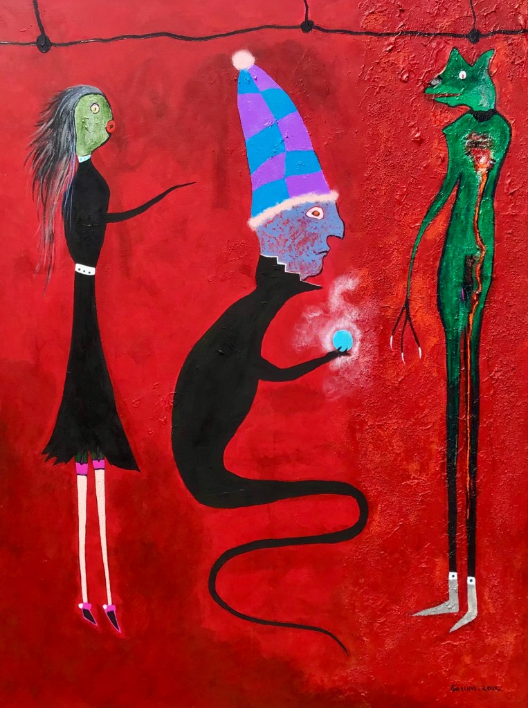The figurative and fantasy-like series called The World of the Unknown Z began in 2003. The project consists of characters who are cast into a world that was once magical, happy, and surreal. Now, the characters struggle to survive after a great war had shattered the fantasy world. These painting are the images and characters that are left and remain in The World of the unknown Z – also known as Zebulon.